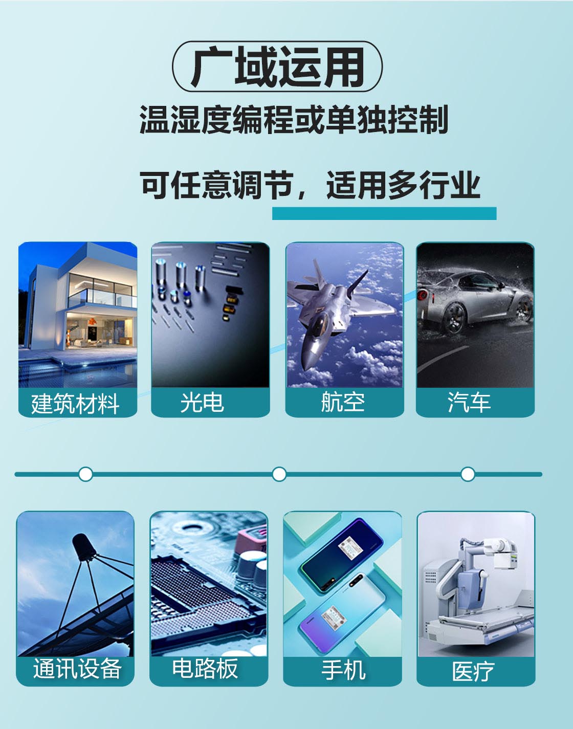 適合電子、電器、手機、通訊、儀表、車輛、塑膠制品、金屬、食品、化學、建材、醫療、航天等制品檢測質量之用。